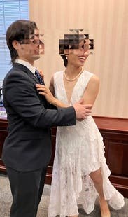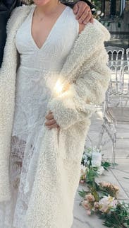 It was almost just right and as expected the chest was a little loose. However, the fabric tape came in handy and kept the dress stuck to me so when I was in different positions I wouldn’t flash anyone. Maybe I personally should’ve gone a size smaller instead of ordering the larger safe pair? Wore 1 1/2 in heels and it barely kept the skirt off the ground, so I did hold it up when I was outside. Certain camera angles made me look at little more short and stocky, but I was still very happy overall to wear this as my courthouse wedding dress. This way the dress won’t collect dust in a closet for the rest of our lives. Thank you to all the staff.
