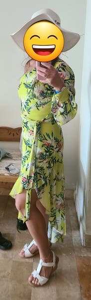 This was a stunning dress!!! Normally I don’t care for asymmetrical dresses/skirts but took a chance with this one anyway and so glad I did! The print is beautiful and I loved the color on me! I felt pretty all day wearing this dress. 😊