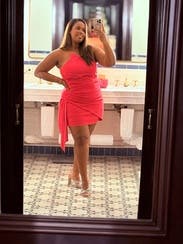 I'm genuinely looking to buy this dress. It is incredibly flattering and it has some stretch to it, which is great for dancing. It's soft and the folds help hide any tummy bloat which is nice. I could have worn the 4, but it was a little gaping in the arms. The 2 wasn't too snug at all, it actually could have been a little tighter. The color is PINK like NEON pink which is super fun.