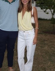 The Gisele Top from One of Others is a halter-neck piece featuring a side button closure and a bold yellow animal print. Pair it with high-waisted linen trousers and strappy sandals for a stylish summer look.