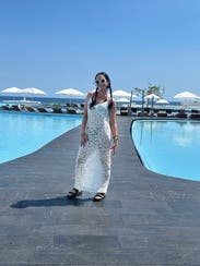 Pretty dress. Wore it as a beach coverup. I read one review that the bottom of the dress is too tight which makes it hard to walk - and that is certainly true.