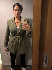 Beautiful olive green blazer for work. Love the belt detail to create a cinched waist. Got a ton of compliments