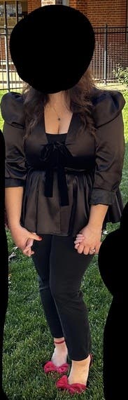 I got this top for a trip to museum. I loved the material and the bow was everything I wanted it to be. I will size down the next time I rent this top. I thought it was super cute and perfect for cooler weather.