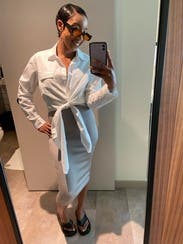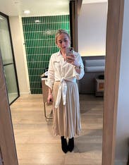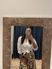 The tie in front spiced this up from a tried and true classic to a “ohh this is a little fun”-classic 😜. True to size. Wrinkled a lot but to be expected I wanted to buy because it would make a nice staple but cost was a bit too high for something that borders staple/necessity without too much luxe