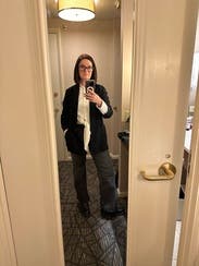 love this top! (bought it.) super versatile and year-round-friendly — i’ve paired with high-waisted shorts and sandals in summer and the above for a casual rehearsal dinner in winter. it does wrinkle really easily tho so wouldn’t travel with it unless you know you’ll have iron access!