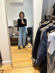 I love the fit of these jeans and wore them at home, but one of the belt loops was barely hanging by a thread so customer service swapped them out for me. They’re thicker than typical stretch denim, but not as sturdy as my Levi’s. The wash works better for casual looks, and I couldn’t see them working for a more dressed up outfit.