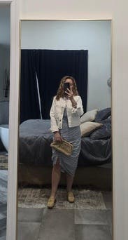 If you are looking for a white denim jacket that can be a bit dressier, this is your piece! I wore it to a beach wedding and then later to Disneyland. Perfect easy piece to throw on top of a summer outfit and still look put together!