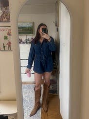 Wore with boots for a concert. Great fit, probably could have gone down but it worked if you tie the waist really tight. Only thing that wa difficult was taking off to go to the bathroom, the buttons are a little tougher. Loved having this for the concert!