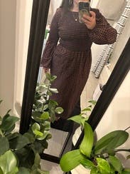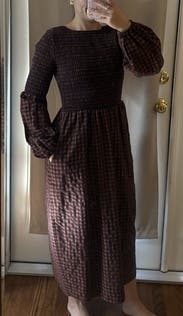 This dress is adorable and I loved the look but I couldn’t wear it while running errands because it narrows and tapers mid-calf. This means the range of each foot step is restricted by the circumference of the much narrower hem. I loved the way it looked, loved that it had pockets, loved the high neck and lower back collar, but the small steps were a tad annoying. While walking with my 3rd grader, my steps had to be smaller than my kid to avoid tripping from the tapered hem. Perhaps sizing up would have resolved this issue, but then I worry about how it would fall on the rest of my body. I also liked that the dress seemed to be brown and navy under some light and brown and black under other lighting. Very cute. Would rent again and possibly try the next size up.