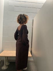 I loved this dress so much I had to learn more about the designer. I love the shape of this dress it is a tulip dress so it rounds out your hips but it is tight around the legs. It did not bother me as long as I took smaller steps. The color of the plaid is beautiful. Very moody fall look.