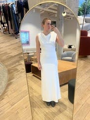 I wore this as my "Mrs." look the day after my wedding. It was the perfect elevated minimalist look and was super light and breezy. I typically wear a 6-8 depending on hip space and the Medium fit me just right!