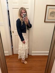 I’m 158 lbs and usually fall between a small and a medium. I’m smaller on top and wider on the bottom, so sizing can be tricky. I typically wear a size 6 or small in designer dresses, but sometimes need to size up depending on the hips. I was nervous since the size 8 wasn’t available, but the 6 fit perfectly! The top has an elastic band in the back, which made zipping it up super easy, and I was able to get it over my hips by pulling the back up slightly. The straps were the only issue—they were too long and didn’t offer much support. I just tucked them in and wore it strapless, and it totally worked. It is a bit see-through, but I wore nude underwear and that fixed it—no issues at all. I got so many compliments! It’s super flattering and a versatile staple you can dress up or down. Loved it!