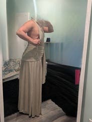 I wore this to my friend's company holiday party & felt great in it all night long. I did cinch up the halter straps to make it a bit more "current". Also, used boob tape and got a bronze spray tan before the big event. The color is a lovely champagne tone that looks great on a variety of complexions. Definitely runs big -- I sized way down to a 4R and it was perfect. **Note: this dress seems to be resistant to ironing/steaming ... not sure why. Fabulous choice overall!