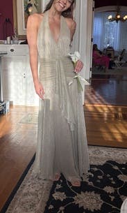 First off, I felt like a movie star in this dress! It has a shiny material that’s both tasteful and elegant. The dress does run large. I usually am a 6 in dresses but could have easily fit in a 2 or 4. It is form fitting but not constructing in the least. The lining is soft and comfortable and I can see myself wearing this all night to a wedding or even a gala! The dress is VERY long and I would need two inch heels for this and I am 5’10 in height. For this dress I do not mind. It is low cut but I was able to wear a plunge bra with no issues at all. Definitely rent this dress!!