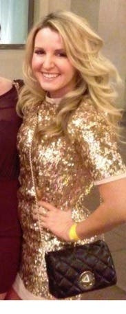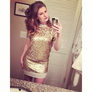I was obsessed with this dress as soon as I saw it on RTR and it was the PERFECT dress for my 23rd birthday! The dress is classy, sexy and you can't go wrong with something that sparkles like that! The sparkles are actually gold and pale pink so I would recommend nude or a bright colored shoe (I wore red). I ordered both the Medium and Large after reading multiple reviews, but felt the Large fit better in the sleeves and for the style of the dress. I would recommend going up a size if you have bigger arms but overall, I absolutely loved the dress and would most definitely re-order!