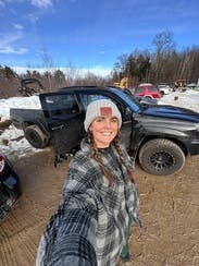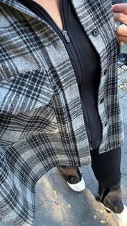 Gray plaid wool blend (50% Wool, 17% AP, 28% Polyester, 3% Acrylic, 2% Nylon). Top. Long sleeves. Collar. Front button closure. 32" from shoulder to hemline. Imported.