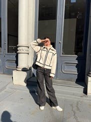 I styled this jacket so many ways. In this photo it was more of a street style vibe and it looked great. But I also wore this with jeans, with dress pants, with a layered outfit, etc. Very cute but hard to keep clean since it’s all white.