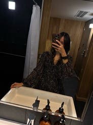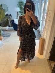 The billowy sheer sleeves, romantic ruffles, and deep V with a perfectly high slit (for a somewhat modest person) gave super fun date night vibes. The V neckline went lower than I thought so the look had a lot more cleavage than I expected., but my date enjoyed it! The best part though is when I crossed my legs. The slit fell open and put my legs on display in a way that will be hard to forget. Gorgeous, comfortable dress. Tempted to buy, but I like that RTR does the cleaning and I can always rent it again!