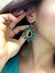 I received these earrings as part of the mystery accessory deal RTR had going. Originally they had chosen a large necklace that would've clashed with the beading detail of the dress neckline but RTR was so accommodating and sent these instead. The color is a little less turquoise and more emerald as others have pointed out but I felt they weren't too dark and still matched the turquoise of my dress. They are a bit heavy at first as I typically don't wear earrings day-to-day but I got used to them fairly quickly. Another great RTR experience!