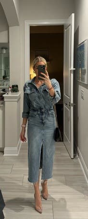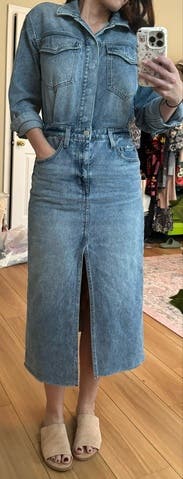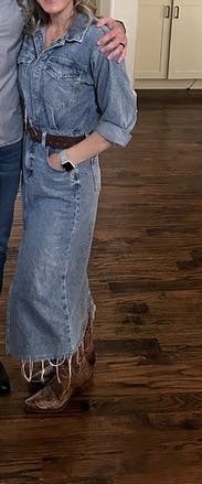 I was skeptical, but this dress delivered. It's a lot of denim...a lot. You have to wear it with a belt. I styled with an Hermes scarf, belt & boots. Very chic and has a raw edge hem. True to size.