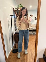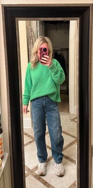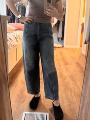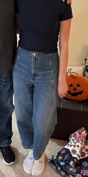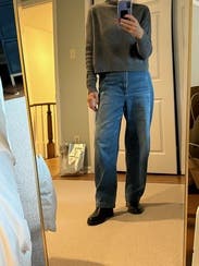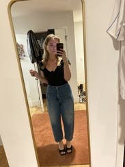 Frumpy is always the risk with this style denim and it can be hard to get it right. These jeans fit TTS and the barrel wasnt too pronounced. But something about the waistline made them look frumpy. Maybe the crotch drops too low, maybe there being no “waistband” makes the jeans feel like there isnt enough shape in the hips/waist? I dont know. But I felt frumpy.