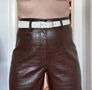 These are a well-made pair of faux alligator pattern pants. I was attracted to the sienna autumn color. The fabric is overall medium weight & comfortable however they were too high waisted for me. Likely this would work best for someone taller with a longer waist. I'm 5'7" with a regular waist line and the top of the pants slightly cut into my rib cage. I still wore them because they are cute (!) so I wore a longer loose & flowing silk blouse to compensate. There was a slight gap at the waist in the back too. Although I do like a high waisted pant, these were too much for my body type.