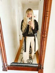 Also wore with black pants it does so much so you are not saying “I’m a server in a restaurant” when you wear all black. I will say for sensitive girlies / guys fabric is a bit itchy. I still haven’t sent this one back I love it. Someone saw me and said it looked like I stepped out of a magazine. No better compliment !
