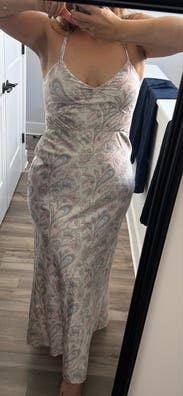 Gorgeous blue, grey and pink print on an ivory base. The material is thinner than a typical slip dress and it has stitching on the bust / bodice that makes it super flattering. I loved the way it hugged boobs / hips. I am short and it hit me at the low ankle. Worn to a wedding, which I think is appropriate depending on the bride (given the shade)