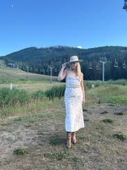 Wore this for a western white welcome party! I have wide hips and a booty and felt like it was a little snug there but my spanx helped. The straps were a little long but overall I think a size up would have been too big because of the straps. Loved this look and got compliments!