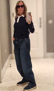 I loved this comfortable navy blue and white polo. It’s flattering and versatile.