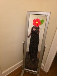 This is a beautiful dress. It’s very feminine and has an interesting, flowing cut. The only issue for me is that the neckline was lower than I realized when I initially tried it on. I had to keep tugging it up during the evening but, fortunately, I wore a black bra so the slippage wasn’t too obvious. 😊