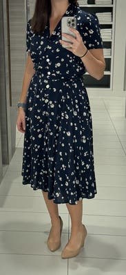 I’ve had my eye on this dress for several rental cycles. I waited for the stars to align (my size to become available and the PNW rain to relent) and finally made my move. I went with the size 8 even though I am consistently a 6 in RL dresses because I wanted to be CERTAIN that I could wear it without having any gaping or pulling at the buttons. I placed my order and waited (those 3-4 days of shipping are interminable, am i right?) My shipment arrives and I am so excited to tear in to that dusty blue bag. Of course, I try her on first. And the fit is *chefs kiss* exactly as I had hoped. Light and flowy and softly sophisticated, perfect for Oregon spring weather. She did not disappoint….not yet, anyway. I pair it with some casual white platform sneakers and head out the door. I am feeling GOOD…for about 20 minutes. The belt on this thing!!! It will not stay cinched and all👏day👏long👏 I am fussing with it, tightening and retightening. Can’t take the damn thing off because RTR has sown it on (understandable I suppose). Can’t put a different belt over because it’s too bulky. So that’s the story of how all my hopes and dreams for this beautiful dress were smashed. Hope you have better luck with it.
