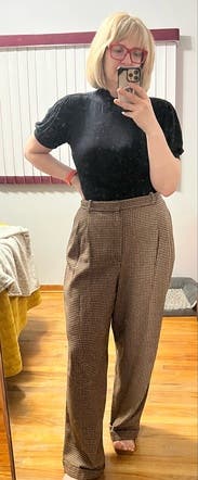 A little itchy but you get over it. I was pleasantly surprised by these pants. Love the plaid, high waisted look. Well placed pleats. Nice fall pant for a crisp day