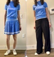I rented this with the matching skirt but you could definitely pair with a white tennis skirt or white jeans/trousers. I just love this look! Perfect shade of blue and super flattering. Would love to buy!