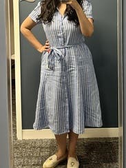 This was so comfortable plus has convenient pockets. the cut of it is very flattering. I'm not large in the chest but I found one of the buttons pulled, so I would wear a slip under it or size up.