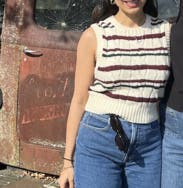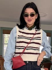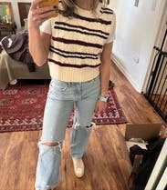 I am SO in love with this sweater vest. I've worn it with both a white tshirt and a white button down underneath to work, and I love it both ways. It's the teensiest bit cropped, so you need at least mid to high rise pants for no gappage. I'm usually about an 8-10 in tops, and the medium fit me perfectly. Re-renting it again for my next shipment for thanksgiving! the colors are so perfect. Creamy white for the majority, and a lovely burgundy and deep hunter green in the stripes. can't wait to get it back!