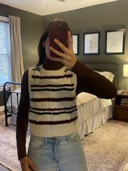 Cute little sweater vest to add texture. Loved the fall colors. Thick, a bit cropped, good with high waisted pants. Not itchy.