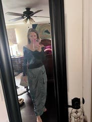 Wore than many times with jeans could dress up or down depending on the shoe. Wasn't baggy, fit perfectly. The cross cross could get annoying at timees but I still loved!
