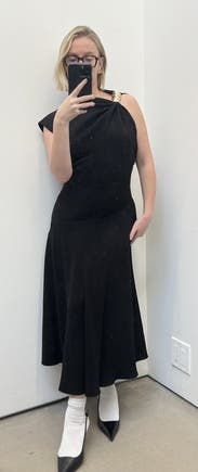 This sculptural Proenza Schouler Rue Dress is an elegant asymmetric midi dress in crepe. Complete this dramatic designer look with strappy heeled sandals and a minimalist clutch.