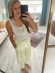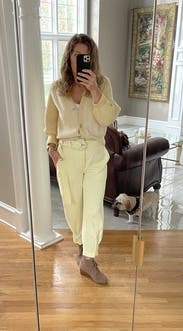 I loved these. They are super comfortable with a substantial weight that makes them move nicely. I wore them to a friend's house for dinner with a casual top but you could easily dress these up. It should be noted these are YELLOW. They looked a bit more white/cream in the photo, but they're a light yellow. I usually wear between an 8-10 and the 10 fit me great.
