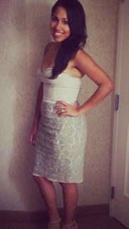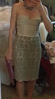 Dress is amazing- runs a bit small and flimsy up top but great for small chested girls. I would suggest fashion tape and spanx but it was very hard to part with!