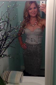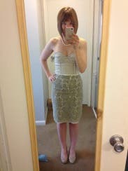The details of this dress are stunning. The yellow stitching over the grey lace is really beautiful. I wore this for my birthday celebration, and thought the dress was gorgeous, but the fit was difficult. It is VERY tight on the hips if you have any at all (and I am kinda hippy), and the bustier is a little tough to work with. I rented the 4 as my normal size & 6 backup- definitely needed the 6. I did wear a strapless bra to help fill it out, but it WILL NOT stay up alone. I used a ton of fashion tape to help with the top. That being said, I did feel really beautiful in the dress, just didn't love it as much as I hoped to.