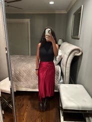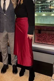 I honestly took a gamble on this one as I’m not a fan of shiny fabrics, but I am so glad I did I’m crazy about this skirt. It is draped to perfection and suuuuuper flattering. The fabric has a sheen but not excessive and does give high quality luxurious energy. I tried it on with a lot of different tops and will absolutely be wearing this many times. Fit TTS comfortably with a little stretch if you have curves. Want to buy!