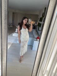 This unique lace dress is gorgeous in person and really breathable, which made it perfect for humid weather. I wore it to dinner on a girls’ trip in Tulum with espadrille wedges and a clutch. It runs true to size, but the layered cut gives it an unusual fit. The chest area was also tricky — snug with a strapless bra, loose with sticky covers, and definitely see-through, so a nude bra is a must. Overall, it’s a beautiful, romantic style that would work just as well for bridal showers or special events as it does for vacation nights out.