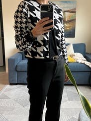 A fun variation on houndstooth with some contrasting pattern interest. Versatile can be worn open or closed but you need a base layer either way. Fit TTS.