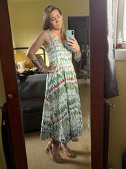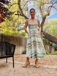 The onion print on this dress is whimsical perfection. It’s colorful, sophisticated, and care free, and I felt like I could dress it up or down. The cotton is smooth and crisp with a beautiful drape, and love that the dress has pockets and adjustable straps. Wore it to the ballet! Loved it and will definitely rent again. TTS