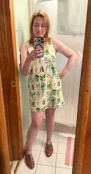Loved this dress! Tons of compliments on the fun pattern and has pockets! On the shorter side.