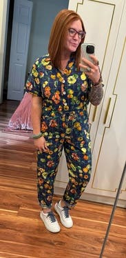 I was not expecting this to be such a compliment magnet! Someone literally chased me down the street to tell me they liked this jumpsuit! Nice, easy summer look in a comfy light cotton. Fit was TTS— roomy but not oversized. Accommodated my curvy lower half.