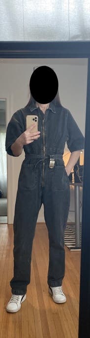 I love jumpsuits to throw on and be done! This one runs very large, I’m 5’2” and 120 lb and got the size 4. Denim jumpsuits are not cozy but super fun anyway. As others mentioned the belt is weird, I just tied it.