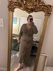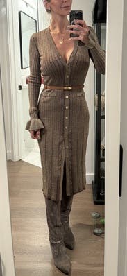 I got so many compliments on this dress it was almost embarrassing! This is a form fitting, sparkly taupe rib knit dress. The sleeves are long with ruffled hem. It is thick and forgiving. Held its shape well. I wore it for an anniversary dinner date and to cocktails another evening. It read as effortlessly elegant, and that is how it felt as well!